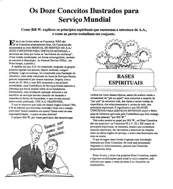 Este é um livreto sobre os Conceitos: Não são os Conceitos propriamente ditos, estes são encontrados no livro “DOZE CONCEITOS PARA SERVIÇO MUNDIAL”, e deveriam ser lidos pelos “servidores de confiança”. Neste livreto, o texto dos próprios Doze Conceitos, sujeito a algumas modificações para torná-lo mais acessível, está indicado por aspas; o resto do texto é ou descritivo ou explanatório.